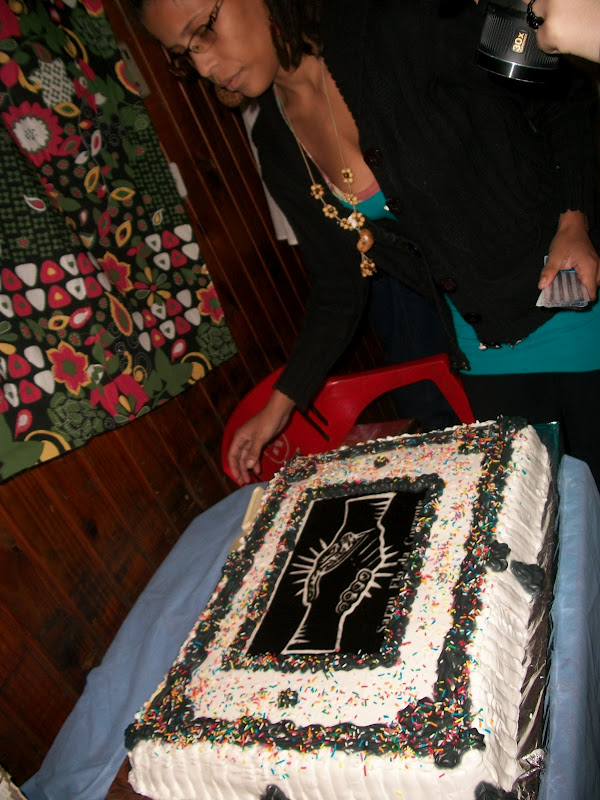 | Raquel, organizadora, prepara o bolo para os parabéns |