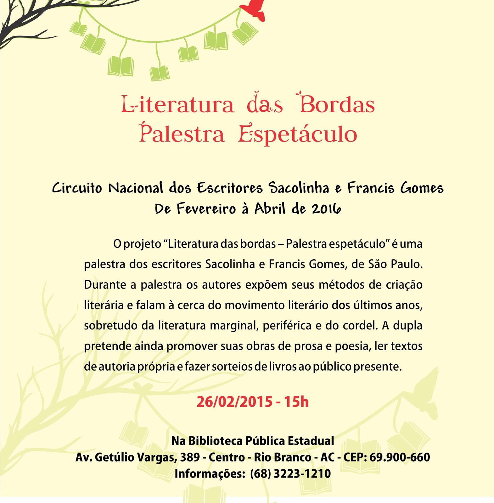 A ação faz parte do projeto “Literatura das Bordas – Palestra-Espetáculo”, selecionado pelo Edital Bolsas de Fomento à Literatura do governo federal, por meio da Diretoria do Livro, Leitura, Literatura e Biblioteca (DLLLB) do Ministério da Cultural (MinC).