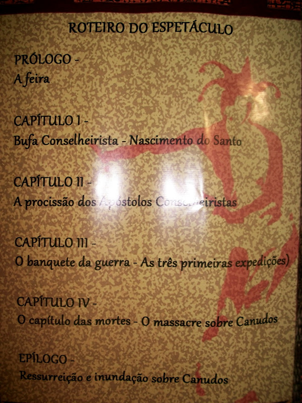 Nos dias 18, 24 e 25 de março, eu e o cordelista Francis Gomes participamos como autores e atores do espetáculo “O incrível homem pelo avesso” do Grupo Contadores de Mentira. A peça trata da história de Antonio Conselheiro e de Canudos. São duas horas de uma das histórias mais sangrentas do Brasil. Durante o espetáculo eu e o Francis participamos recitando poesia e vendendo livros na feira de Canudos. Muita honra poder fazer parte de uma atividade como essas e contribuir para que a história dos vencidos não seja esquecida. Como diz o provérbio africano e também o Coletivo Griots “Até que os leões possam contar suas próprias histórias, as histórias de caça sempre irão glorificar o caçador”.