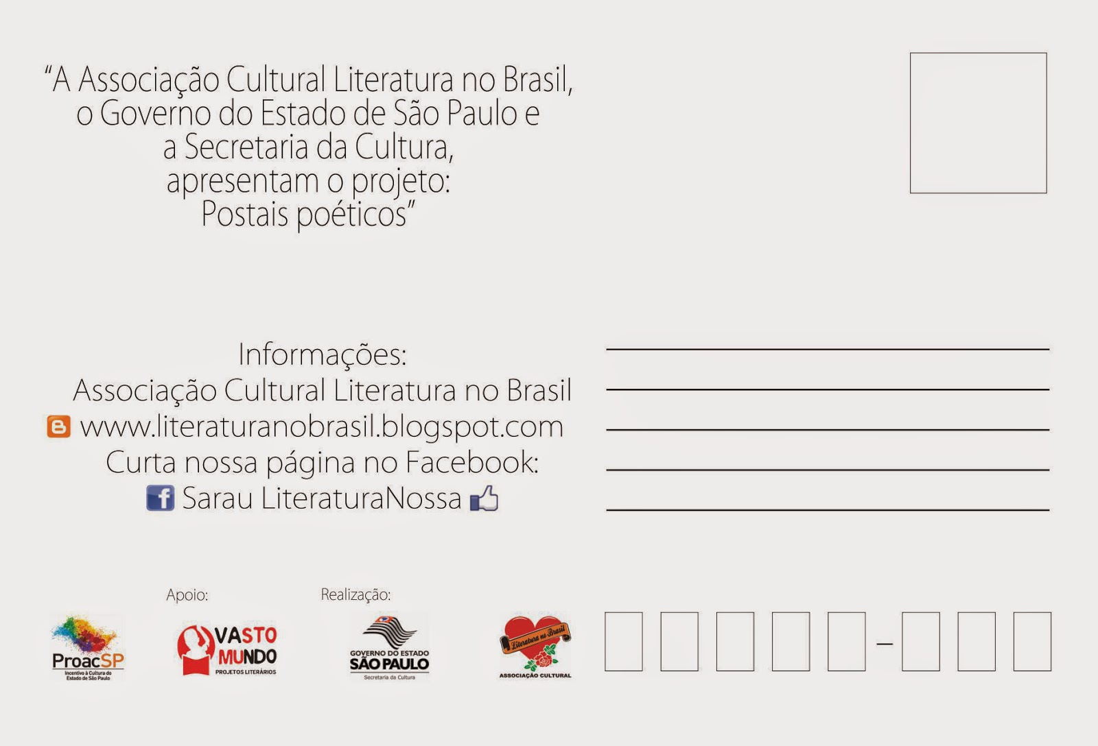 A Associação Cultural Literatura no Brasil com o apoio do ProAC (Programa de Ação Cultural do Estado de São Paulo) lança no mês que vem o projeto “Postais Poéticos”. Esta é mais uma ação de incentivo à leitura integrada ao Sarau LiteraturaNossa, que além dos postais, tem também saraus nas escolas, imãs-poéticos e outras ações que irei divulgando aqui aos poucos. Se depender da gente todas as crianças, adolescentes e jovens serão atingidos pela leitura. Já disse e torno a dizer: Todo mundo gosta de ler, só que muitos não sabem… ainda.