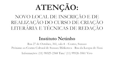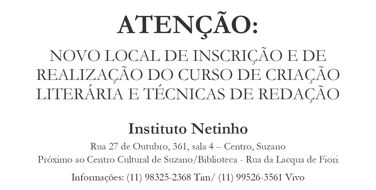 Local das inscrições e do curso: Instituto Netinho – Rua 27 de Outubro, 361, sala 4 – Centro, Suzano – Próximo ao Centro Cultural de Suzano/Biblioteca – Rua da Lacqua de Fiori