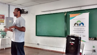 Na segunda-feira estive no Jd. Guacuri em SP, fazendo a minha última palestra do semestre. Desta vez foi na Casa de Cultura e Cidadania, à convite do Rodrigo Mar. Falei com a galera que frequenta o espaço e com os educadores. Turma aguerrida e bem plugada na atualidade. O espaço é bem bonito e estruturado, cheio de verde, com um circo, biblioteca e várias salas. Fiquei só pensando em como seria ótimo se cada bairro ou município pequeno tivesse um espaço deste. Afinal, não é de hoje que a militância cultural luta por casas de cultura. Um dia a gente chega lá, estamos lutando e caminhando pra isso. Mas enquanto não acontece, dá uma olhada nas imagens da palestra.